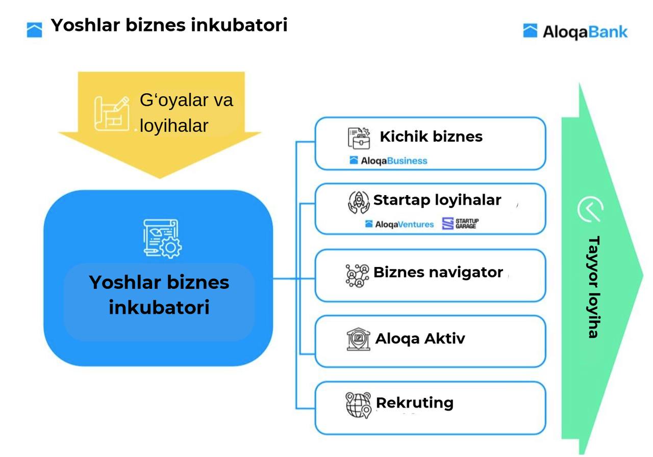 AloqaBank tomonidan "Yoshlar biznes inkubatori" tashkil qilinib, unda yoshlar o‘z g‘oyalarini startapga aylantirish imkoniyatiga ega bo‘ladilar. Bu dastur doirasida loyihalar 6 oy dan 3 yilgacha qo‘llab-quvvatlanadi va tayyor biznes yoki korxona darajasiga olib chiqiladi.